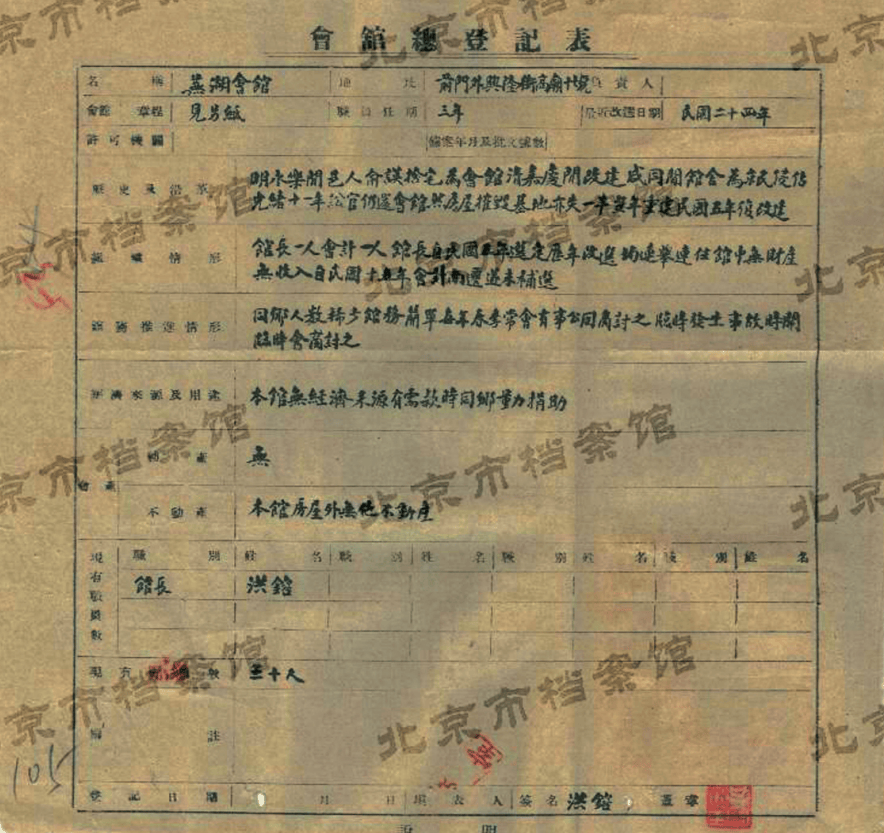 ▲图为 1935年北京会馆总登记表中,登记的芜湖会馆信息(来源:北京市档案馆)