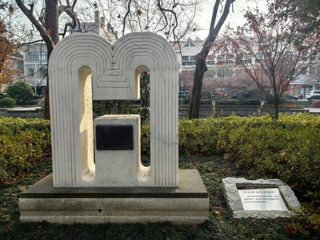 捐书纪念基石的主体由汉白玉雕刻而成,镂空造型如“H”(“洪”拼音首字母),又如翻开的典籍。